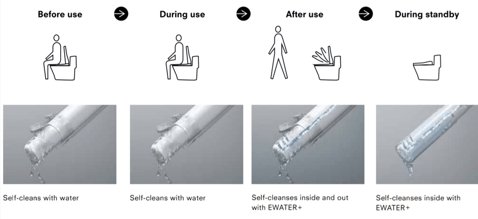 Before and after each use, the wand automatically washes itself with EWATER+. This thorough cleaning occurs inside the wand as well as all around the exterior. Even when the toilet is not being used, the wand periodically cleans itself to ensure constant hygienic conditions.