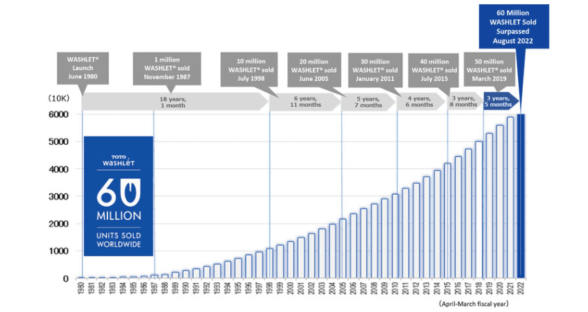 TOTO launched its first ever electronic bidet seat, WASHLET™, back in June 1980. Today, we are astounded to announce that it has finally break the 60 million units sold mark! The massive jump from 50 to 60 million took place in just three years time – a strong statement to justify TOTO’s exceptional concept, innovation, technology, design, and performance.